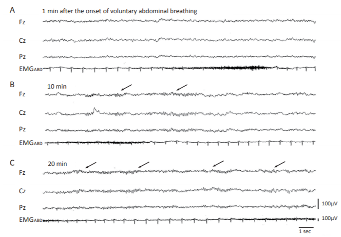 この論文によると、数息観を5分間行った時点から被験者からα波が見られ、その後α波の出現頻度は増大して頻繁に確認されたと報告しています。